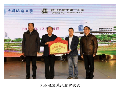 在之后举行的优质生源基地授牌仪式上,我校本科生院常务副院长周建伟教授代表学校向鄂尔多斯市第一中学授予中国地质大学(武汉)“优质生源基地”牌匾,校长白玉亮接牌。王焰新院士、万世斌局长共同见证并合影留念。
