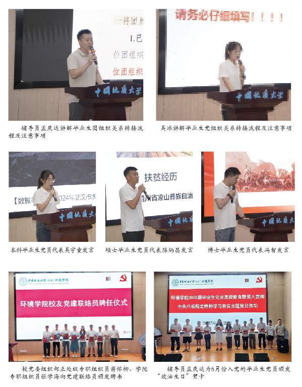 蒋怀柳总结讲话。她高度评价环境学院坚持党建与业务深度融合取得的系列党建工作成果,并对学院校友党建联络员的工作创新表示充分肯定。她指出,当前全校上下正在开展深入贯彻中央八项规定精神学习教育,学校党委认真组织、精准发力,一体推进学查改。她希望同学们以此为契机,要始终坚定理想信念,强化政治担当;要永葆赤子情怀,锤炼过硬本领;要严守纪律规矩,筑牢廉洁防线。她勉励大家以知行合一的担当和地质报国的赤诚,在推进人与自然和谐共生的现代化征程中展现担当作为、贡献青春力量。