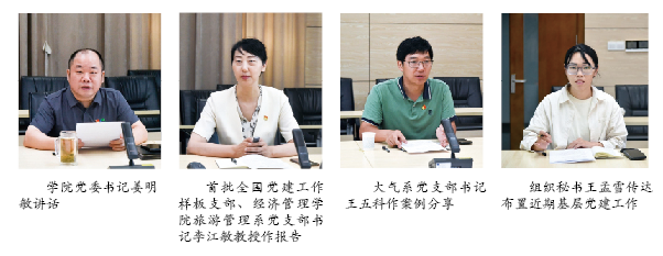 大气系党支部书记王五科以支部与武汉区域气候中心第二党支部开展联合主题党日为例作案例分享。他提到,联合主题党日不仅是党组织生活的重要组成部分,也是加强党员教育、管理和监督的有效途径。开展联合主题党日活动既能增进校内校外相互了解,拓宽党建和业务合作渠道,又能为加强党的建设、提高党员素质、增强组织凝聚力、推动党建工作创新、密切党群关系等创造有利条件。针对学院三级单位多、教师规模大、日常交流不足等情况,他建议积极搭建交流平台,通过组织开展新入职教师见面会、跨系联谊活动、师生联合主题党日等,促进教师及师生之间相互了解,进一步增强凝聚力。