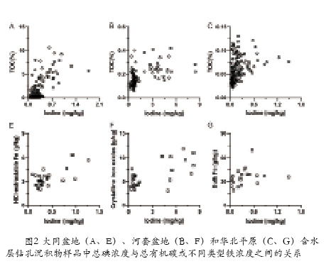 鉴于碘的亲生物特性,生物成因的陆相源/海相源的有机质和与有机质结合铁矿物是含水层中碘的主要物源(图2)。相对于内陆盆地,滨海地区浅层和深层地下水会因海侵或海水入侵直接受到海相碘的影响(海洋是地球上最大的碘库)。地下水系统中碘主要以碘酸根(IO3−)、碘离子(I−)和有机碘(OI)形态存在,其中水相中以I−为主,而固相沉积物中则以IO3−和OI为主。众多水文地质过程和生物地球化学过程能够促进含水层中沉积相的碘向地下水中释放,从而形成高碘地下水。
