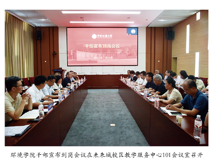 2025年7月8日,环境学院干部宣布到岗会议在未来城校区教学服务中心101会议室召开,会议采取线上线下同步进行。校党委副书记、纪委书记唐忠阳,校党委常委、党委组织部部长、党委统战部部长陈文武,学院党政领导班子成员,三级单位党政负责人及教职工代表等参加会议。陈文武主持会议。