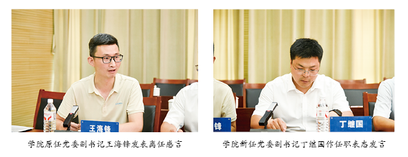 陈文武宣读学校党委任免文件,介绍到岗同志简况。她代表党委组织部对王海锋同志长期以来对学院党建工作、学生工作等的付出和贡献表示感谢,希望丁继国同志尽快熟悉岗位职责,确保各项工作平稳有序过渡。希望学院全体教职工全力支持和配合丁继国同志的工作,学院党委要主动担当作为,深入贯彻落实中央八项规定精神,扎实推进学校各项决策部署落地见效,并注重经验总结和成果推广,为学院高质量发展提供坚实保障。